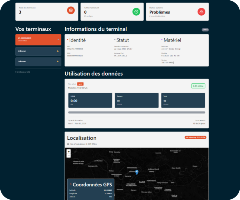 Conçu pour les opérations exigeantes, ce tableau de bord vous offre une vue complète de vos équipements, de vos consommations et de vos performances de connexion.